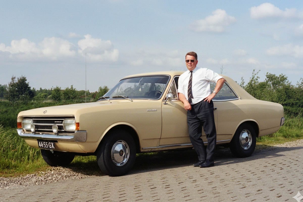 Bijschrift: Schuif met het schuifknopje om het verschil te zien. Links staat de originele zwart-witfoto, met lichte beschadigingen. Rechts heeft AI de foto hersteld en realistisch ingekleurd: de auto, de kleding en zelfs de lucht komen weer tot leven. De beige kleur van de auto klopt volledig, aldus de eigenaar van de foto.